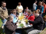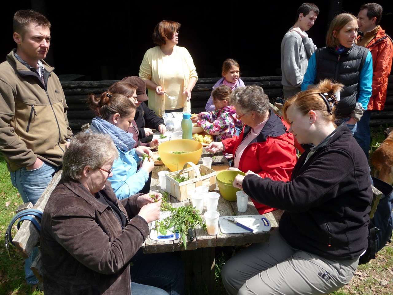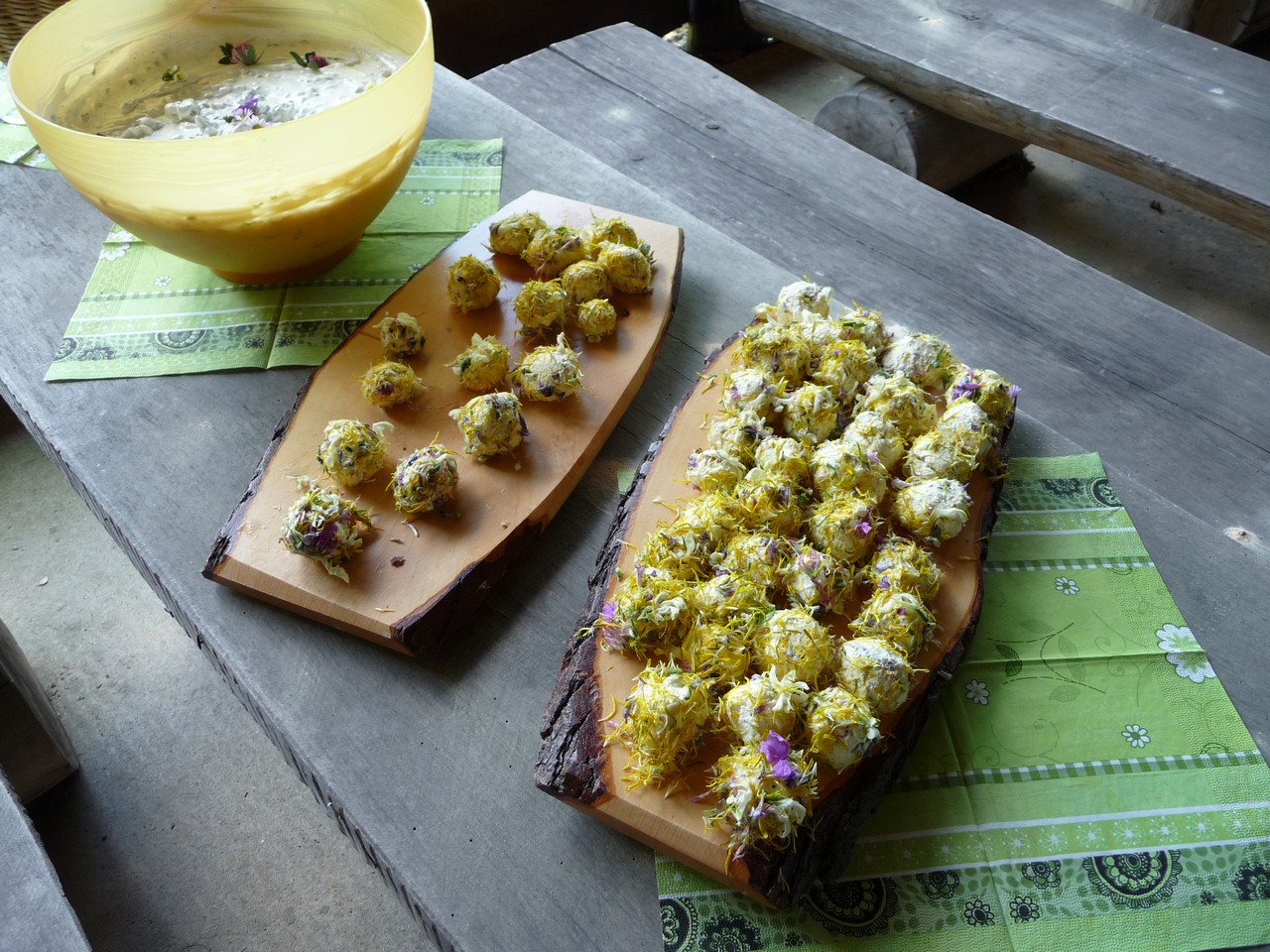 Und da die Cratzer nicht einfach irgendein Verein sind - die Cratzer widmen sich der lebendigen Darstellung des Mittelalters - waren neben Geschmack, Vitamin- und Mineraliengehalt auch die Verwendung der Kräuter durch unsere Vorfahren der vergangenen Jahrhunderte Thema des Tages. Ziel war dann wieder der Grillplatz Wallbach, wo die gesammelten Pflanzen zur Zubereitung von Kräuterbutter und Kräuterquark verwendet wurden, wärend die Blüten dekorativ in Frischkäsebällchen verarbeitet wurden. Spätestens jetzt meldete sich der Hunger und man genoss zum Abschluss das nur scheinbar einfache Essen aus Brot mit Kräuterbutter, Kräuterquark und Blüten-Käsebällchen in netter Gesellschaft.